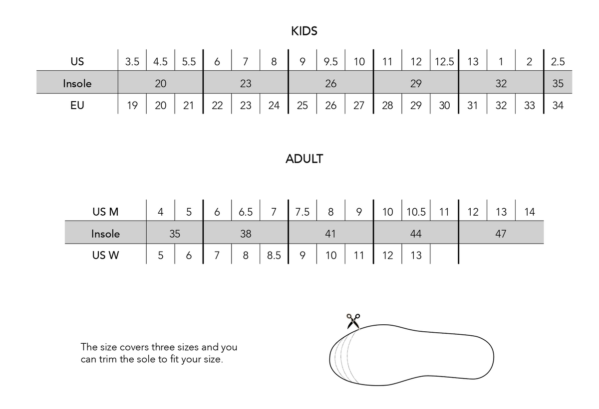 The sizing covers three sizes and you can trim the sole to fit your size.