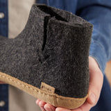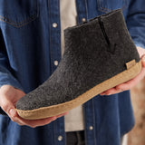 Our boots are made of 100% pure, natural wool in the classic colour charcoal with a sole of soft and chrome-free calfskin.