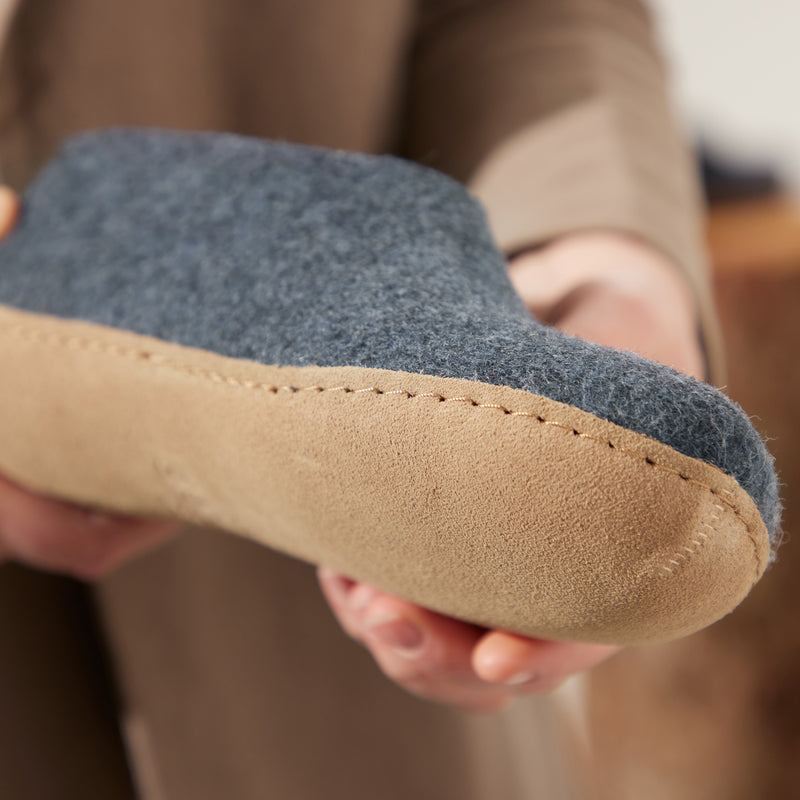 Our slippers are made of 100% pure, natural wool in the classic colour denim with a sole of soft and chrome-free calfskin. We started making slippers over 30 years ago - in fact, our founder Nanny Glerup made the first pair of slippers as a declaration of love to her husband Ove.